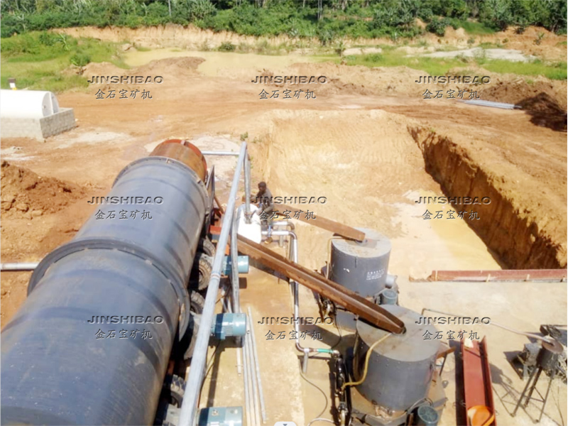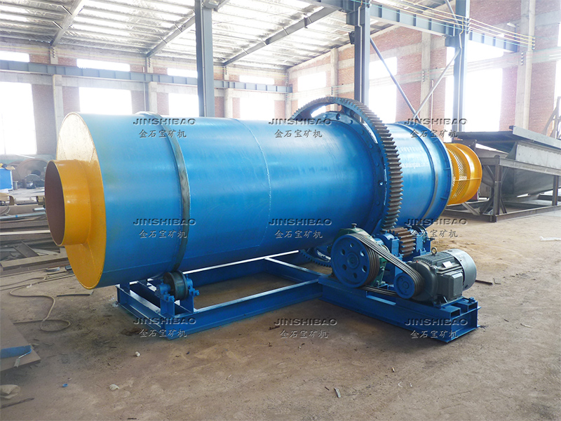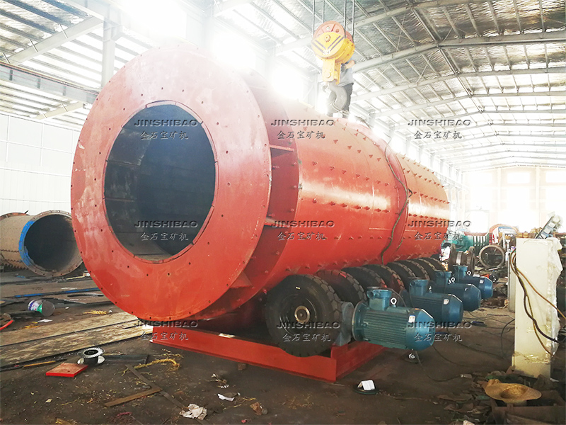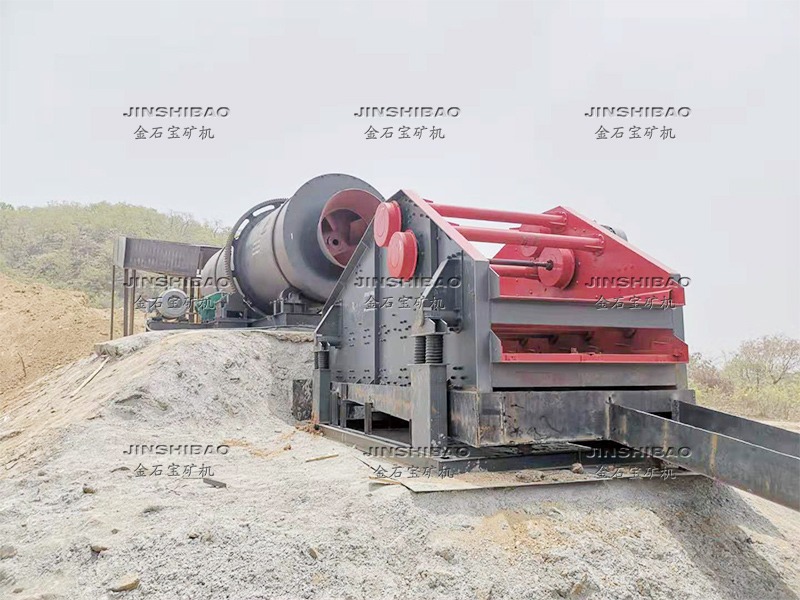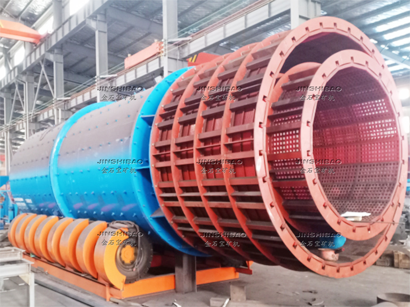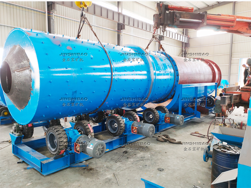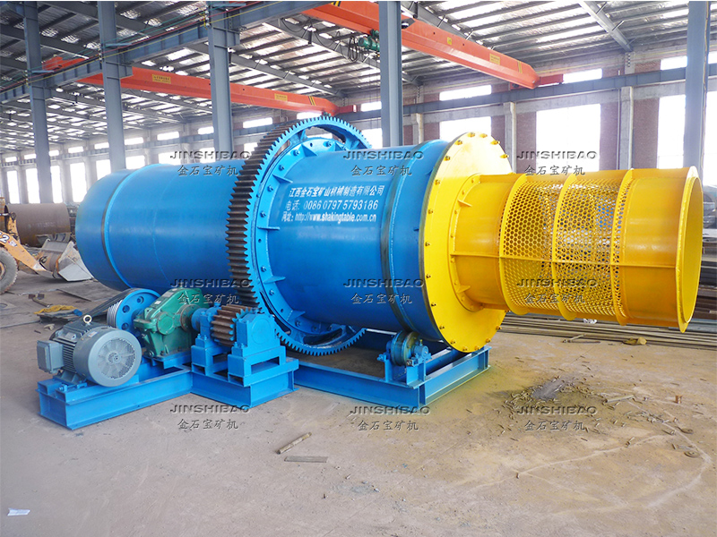 滾筒洗礦機(jī)的筒體由四個(gè)滾輪支撐,電機(jī)帶動(dòng)減速機(jī)傳動(dòng),大小齒輪帶動(dòng)清洗筒體低速旋轉(zhuǎn)。含有泥團(tuán)或石粉的物料從進(jìn)料口給入,進(jìn)入旋轉(zhuǎn)的滾筒內(nèi),清洗滾筒內(nèi)壁安裝有一定角度的攪拌葉片,同時(shí)物料不斷被帶起拋落,自進(jìn)料端到出料端移動(dòng)過(guò)程中多次循環(huán),并被順向或逆向的高壓沖洗水沖刷洗滌,清洗干凈的物料經(jīng)過(guò)尾部出料端篩分脫水后排出,從而達(dá)到洗礦、篩分、脫泥作業(yè)。